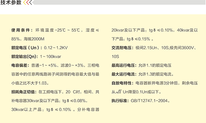 該產品采用優(yōu)質的鋅鋁復合金屬化聚丙烯薄膜或金屬化內串膜作為介質,并吸收國內外先進的生產技術、工藝和設備,嚴格按照GB/T12747.1-2004標準組織生產,采用非可燃性油浸式和干式結構,安全性能高。